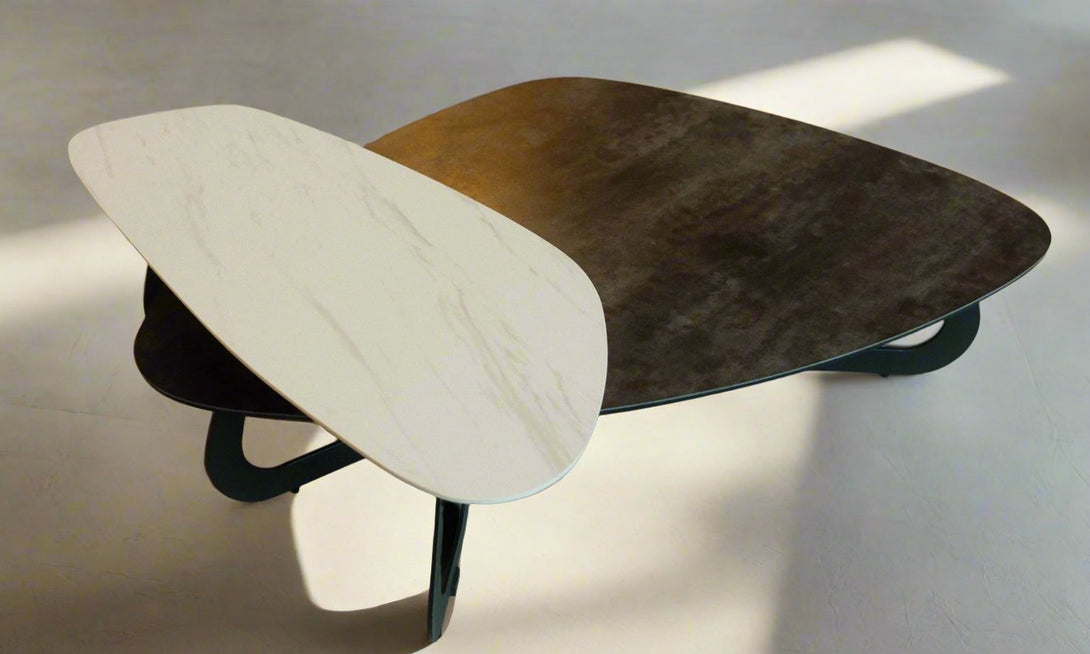 Add a touch of contemporary artistry to your living room with this dual-tone nesting coffee table. Featuring an elegant asymmetrical design, the combination of matte bronze and white marble textures exudes sophistication and versatility. The nesting structure offers dynamic display options and easy space-saving functionality, perfect for modern homes seeking both form and function.