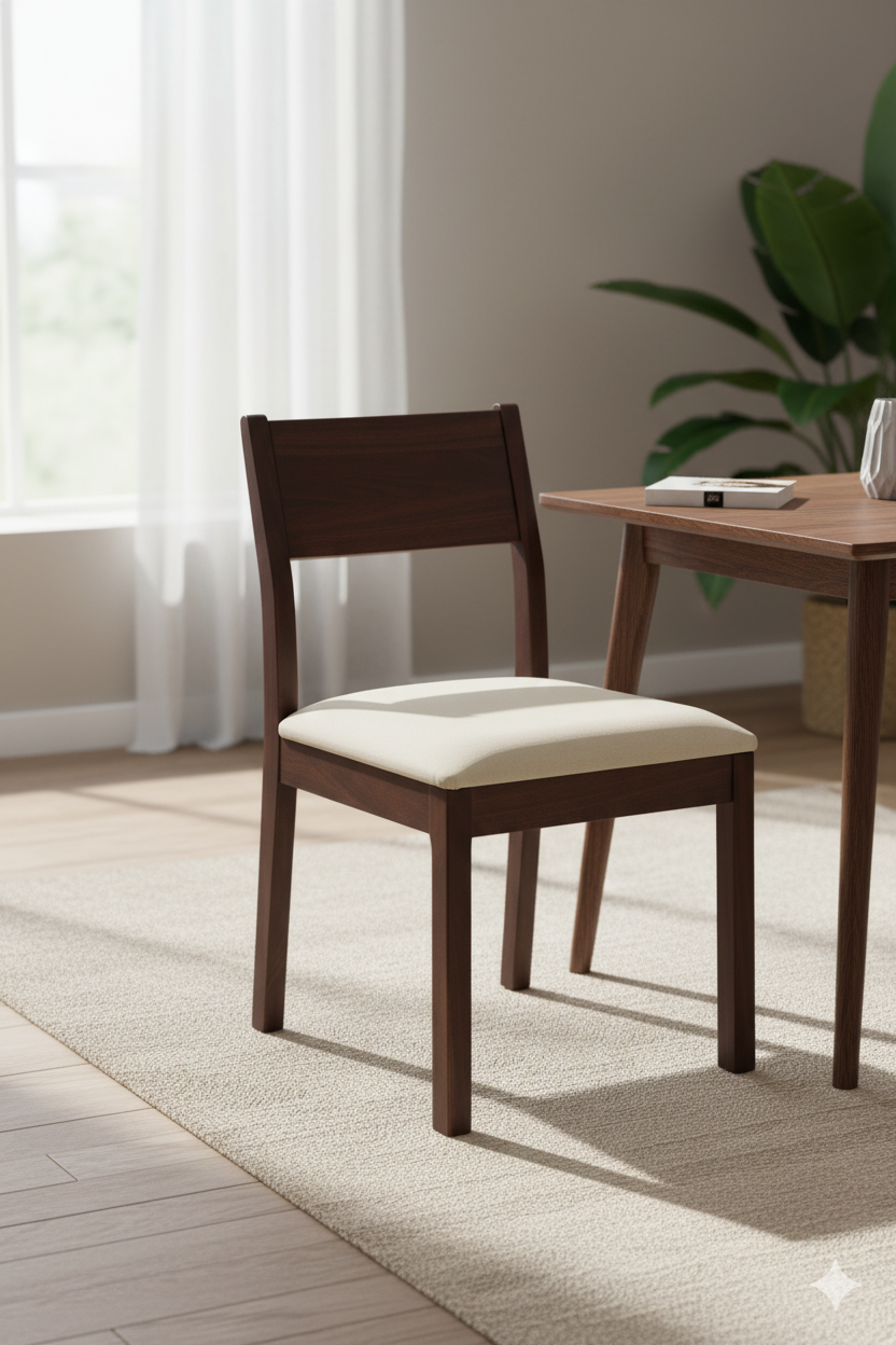 The Luminé Walnut Dining Chair with Upholstered Seat blends solid walnut craftsmanship with modern comfort. Its dark walnut frame provides sturdy support, while the cushioned seat in a neutral fabric finish offers a soft and inviting seating experience. With clean lines and a balanced silhouette, this chair complements a wide range of dining tables, making it a versatile choice for contemporary dining spaces.