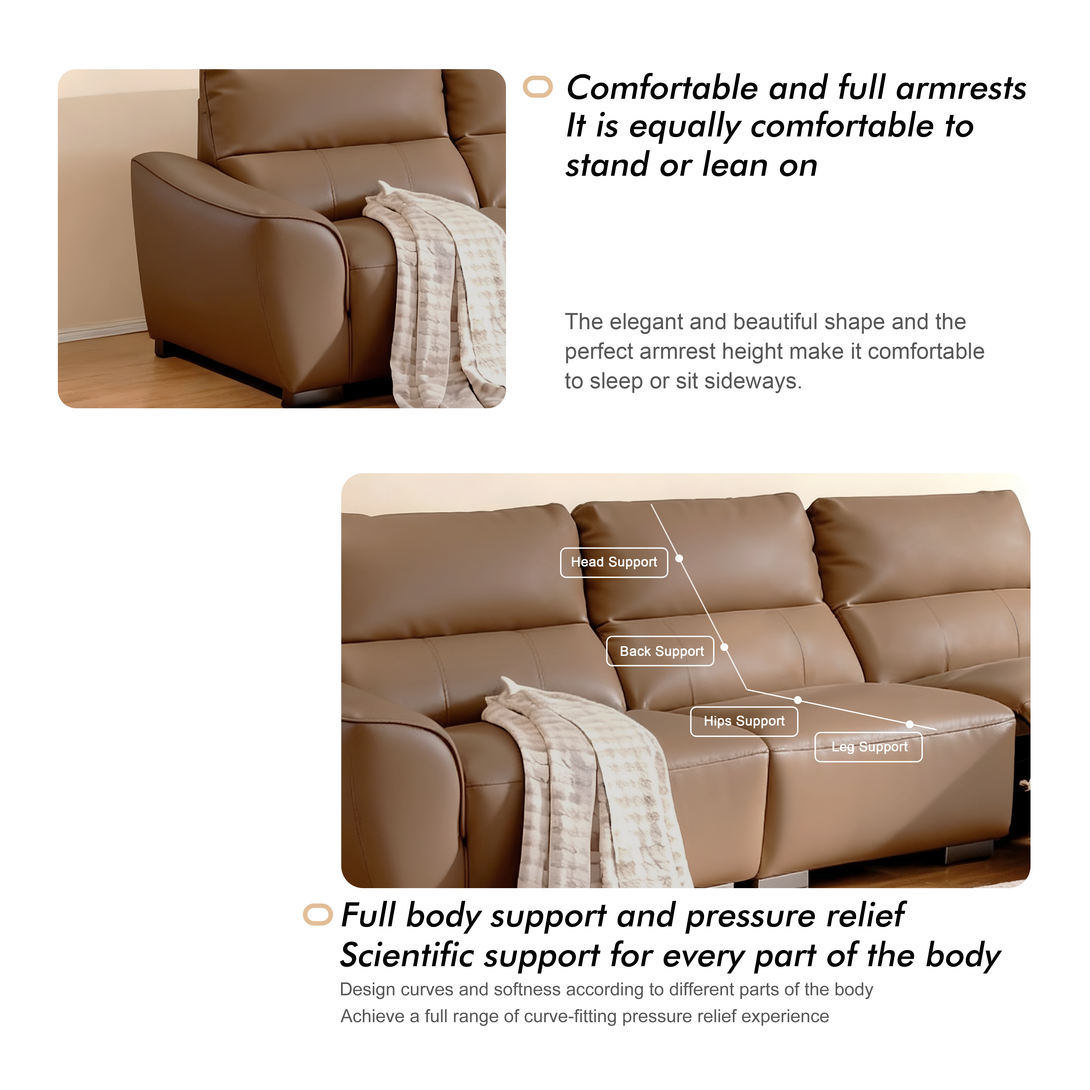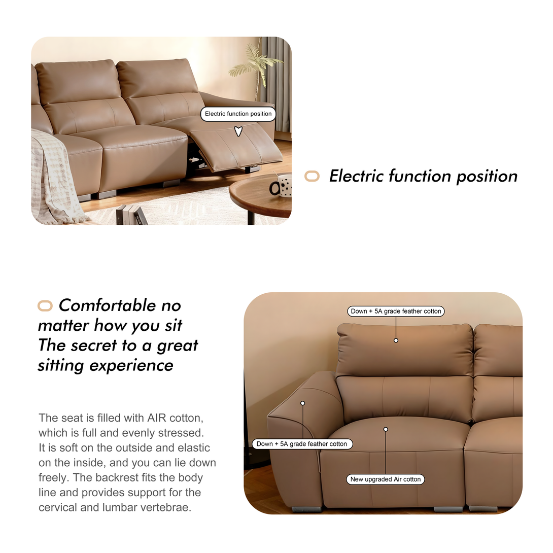 Upholstered in supple charcoal-grey leather, its clean and refined design combines comfort with contemporary style. The powered armrest seat reclines smoothly at the touch of a button, allowing each family member to unwind with ease. With adjustable headrests, ergonomic cushioning, and a sleek modern silhouette, Luno transitions effortlessly between laid-back lounging and elegant entertaining.