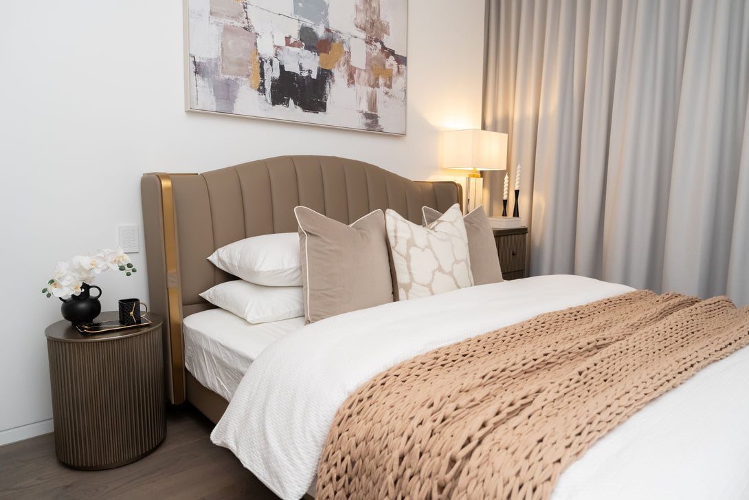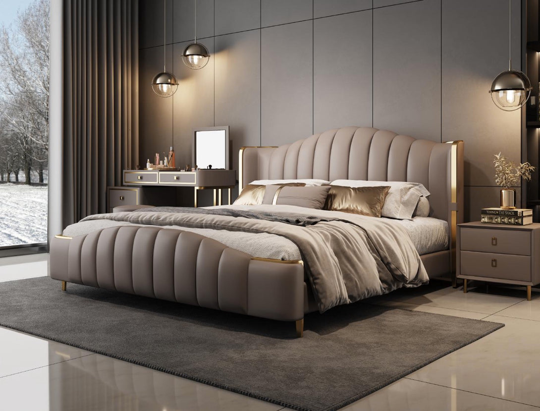 Product Description Luxe Arc Upholstered Bed with Gold Trim – Modern Elegance for Sophisticated Bedrooms Elevate your bedroom aesthetic with our Luxe Arc Upholstered Bed, a statement piece that fuses contemporary...