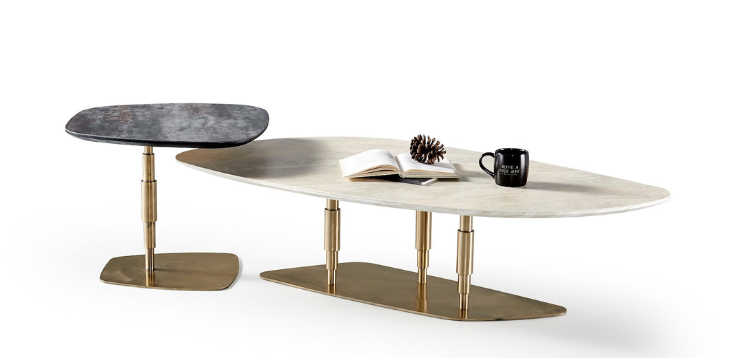 Elevate your living room with this elegantly sculpted twin-tier coffee table. The unique design features an asymmetrical dual tabletop – a luxurious white marble surface complemented by a textured bronze finish, creating a striking yet harmonious contrast. Supported by sleek brass cylindrical legs and a weighted base, this table is both a functional centerpiece and a statement of modern sophistication. Ideal for contemporary spaces seeking refined artistry and practicality.