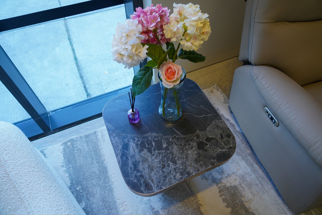Moonstone Marble Side Table is a compact yet striking accent piece. Crafted with natural dark grey marble and a sleek stainless steel base, its smooth rounded corners offer both safety and elegance. Perfect for beside the sofa or bed, it brings functionality and refined beauty to any corner of the room.