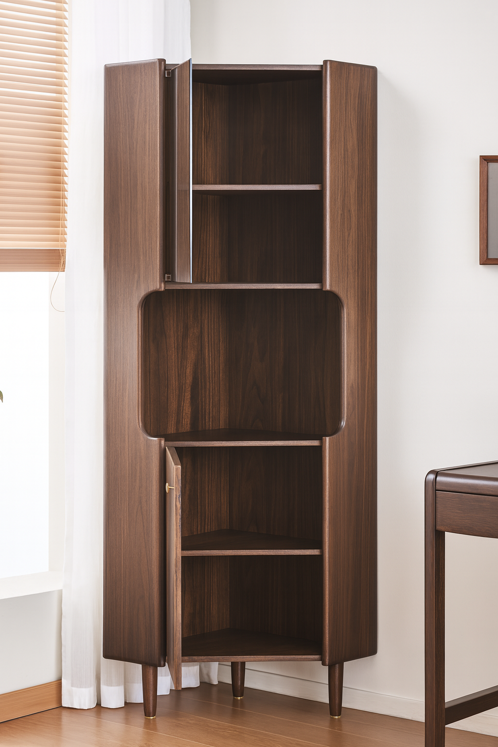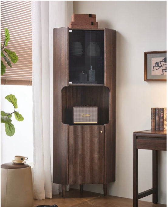 This solid wood corner cabinet is expertly designed to maximize unused corners while enhancing your interior with refined elegance. The upper section features a vertical glass door for showcasing art pieces or fine tableware. The middle open shelf offers easy access to daily items, while the lower louvered door conceals miscellaneous belongings. Its three-section layout balances form and function, making it ideal for living rooms, studies, or entryways.