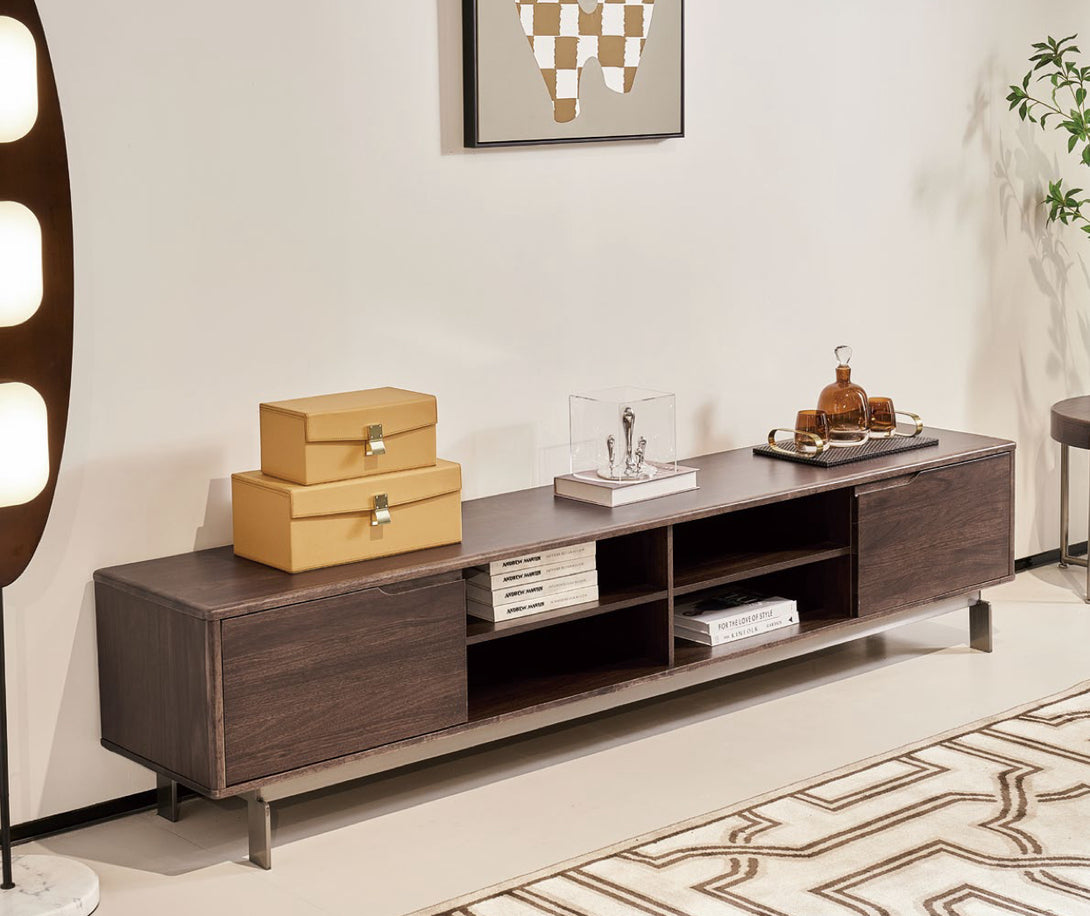 This Solace TV stand showcases the aesthetics of modern living with its minimalist silhouette and rich Walnut finish. The cabinet features two flap-door compartments on either side, providing hidden storage for remote controls, wires, and other items. The center section consists of four open shelves, ideal for books, sound systems, or gaming consoles. Rounded edges and metal legs add both safety and sophistication. Perfect for urban homes seeking both functionality and elegance.