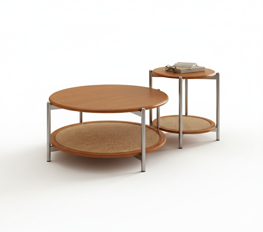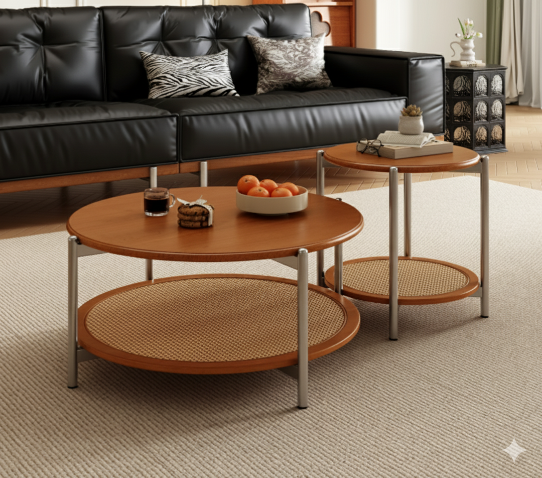 This set of Vintage rattan round nesting coffee tables combines retro charm with practical design. The smooth walnut-finished tops are paired with handwoven rattan shelves, offering both storage and display space. Supported by sturdy metal legs, the tables provide durability and stability. The nesting design allows flexible use – they can be used together as a set or separately to fit different living spaces.
